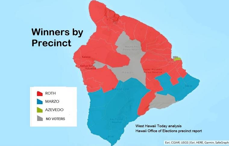 That’s according to a West Hawaii Today analysis of precinct reports released Sunday by the state Office of Elections. The analysis showed front-runner Mitch Roth taking 32 precincts, with second-place Ikaika Marzo securing nine.
