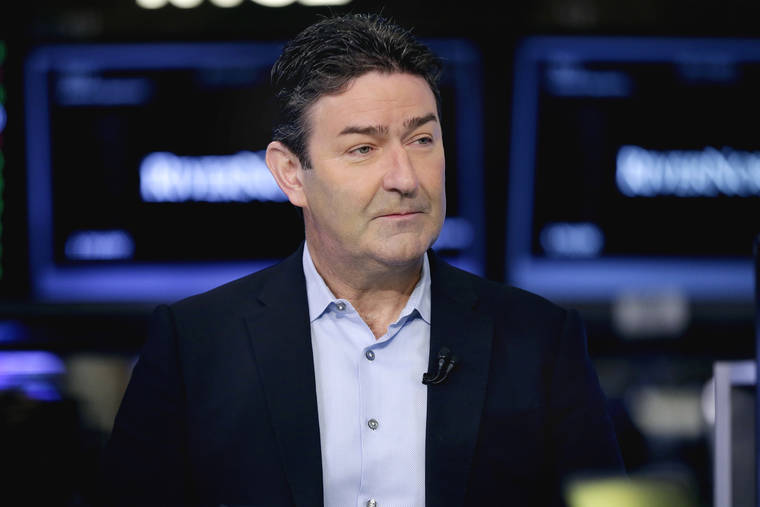 FILE - In a July 26, 2017 file photo, McDonald’s CEO Steve Easterbrook is interviewed at the New York Stock Exchange. McDonald’s is suing Easterbrook, the former CEO, saying he lied about relationships with employees and destroyed evidence before he was fired from the company in 2019. McDonald’s fired Easterbook last November after he admitted to an improper relationship with an employee, with whom he exchanged videos and text messages.(AP Photo/Richard Drew, File)