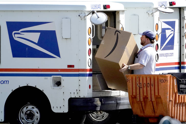An Amazon package is loaded onto a U.S. Postal Service truck Tuesday in Portland, Maine. (AP Photo/Robert F. Bukaty)