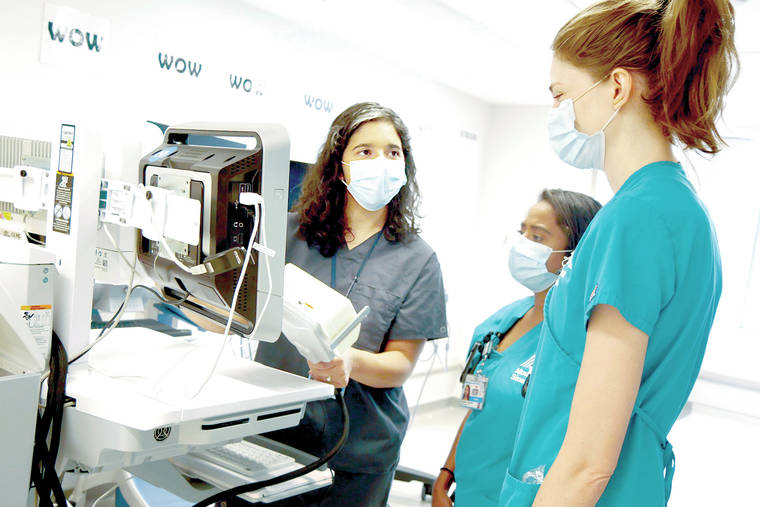 In this August 2020 photo provided by the Mount Sinai Health System, neurologist Dr. Alexandra Reynolds holds part of a device that tracks blood flow in the brain, at a hospital in New York. Reynolds was checking comatose COVID-19 patients for signs of a stroke when she stumbled onto a new clue about how the coronavirus may harm the lungs - thanks to a test that uses tiny air bubbles and a robot. (Mount Sinai Health System via AP)