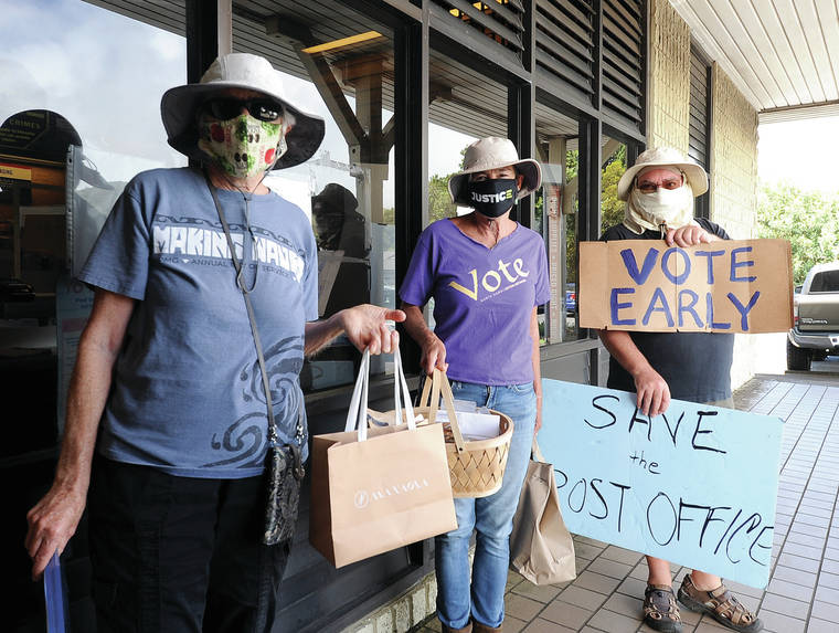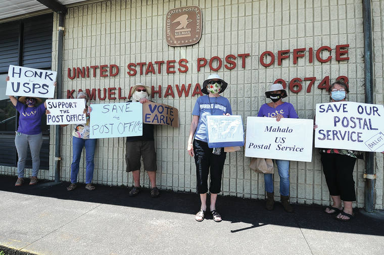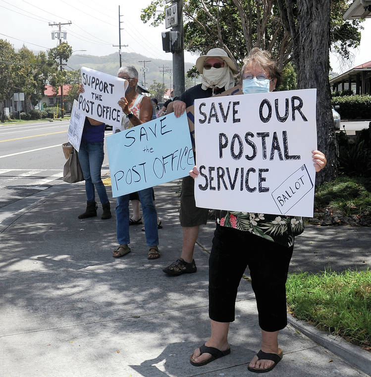 A small but passionate group of individuals were met with honking horns as they waved signs on Mamalahoa Highway Saturday in Waimea in support of postal workers.