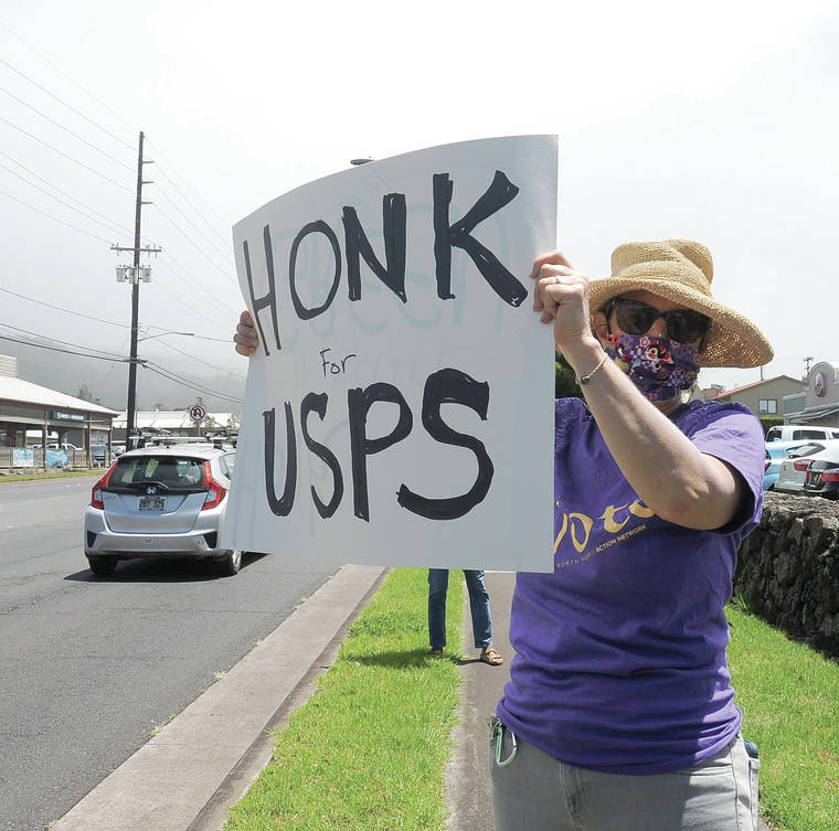 A small but passionate group of individuals were met with honking horns as they waved signs on Mamalahoa Highway Saturday in Waimea in support of postal workers.