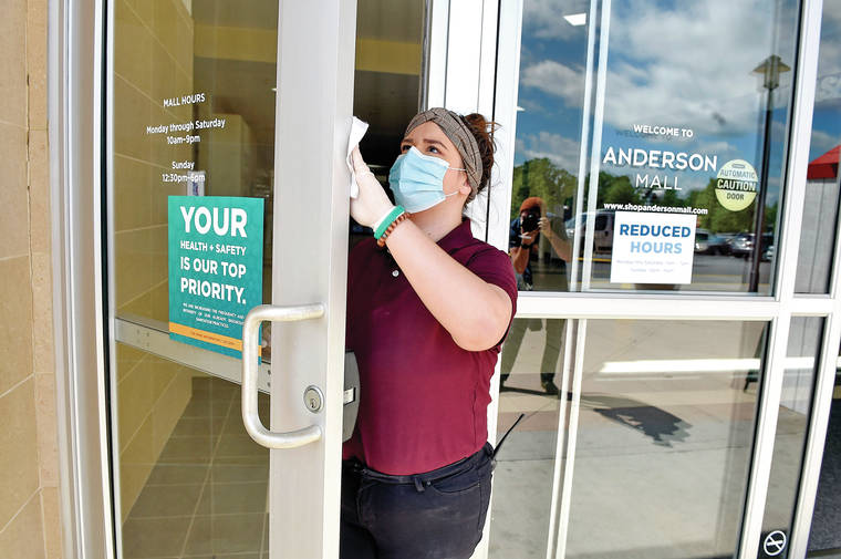 In this April 24 file photo, Kendall Ballew, an employee of the Anderson Mall, cleans the doors before the mall opened to limited business in Anderson, S.C. (AP Photo/Richard Shiro, File)