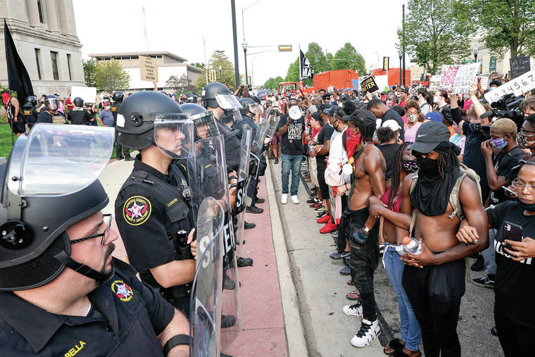Protesters link arms in front of a police line outside the Kenosha County courthouse Monday in Kenosha, Wis. (AP Photo/Morry Gash)
