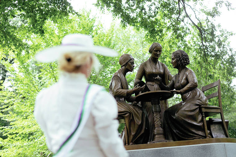 The 14-foot-tall monument to the three 19th century advocates, dedicated on the 100th anniversary of the ratification of the amendment that enshrined women’s right to vote in the U.S. Constitution, joins prominent men including Hans Christian Andersen, Simón Bolívar and Alexander Hamilton who are honored with busts and statues in the 840-acre New York City park.