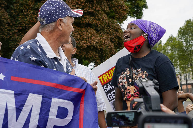 Supporters of both President Donald Trump and Black Lives Matters clash in a park outside the Kenosha County Courthouse, Tuesday, Sept. 1, 2020, in Kenosha, Wis. (AP Photo/Morry Gash)