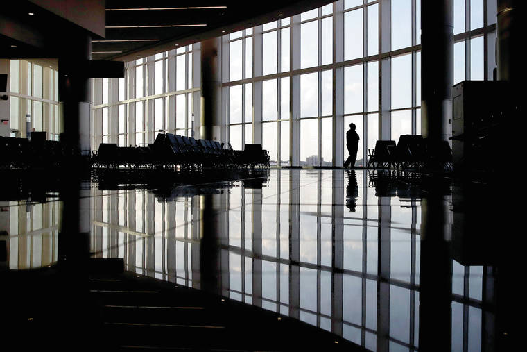 FILE - In this Monday, June 1, 2020 file photo, a woman looks through a window at a near-empty terminal at an airport in Atlanta. Anxiety and depression are rising among Americans compared with before the pandemic, research suggests. Half of those surveyed in a study released on Wednesday, Sept. 2, 2020, reported at least some signs of depression. (AP Photo/Charlie Riedel)