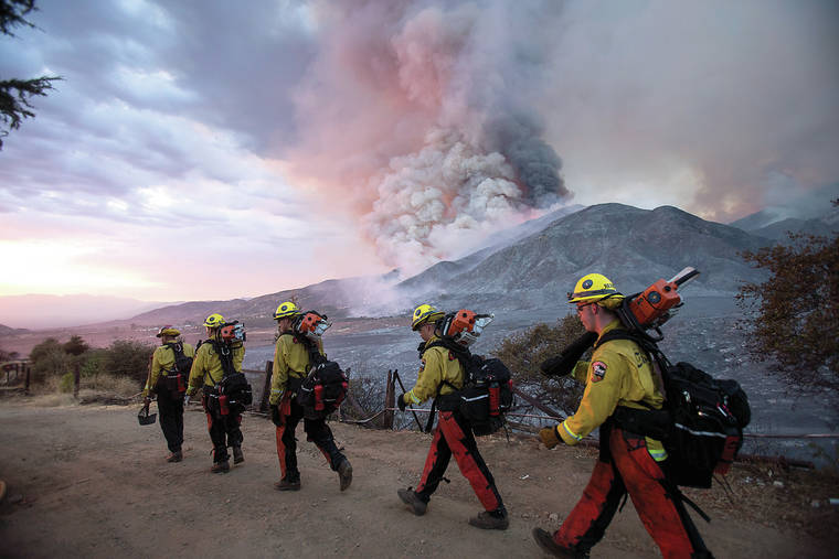 Firefighters walk in line during a wildfire Saturday in Yucaipa, Calif. (AP Photo/Ringo H.W. Chiu)