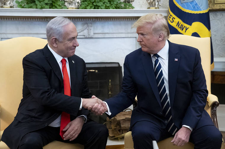President Donald J. Trump, right, shakes hands with Prime Minister of Israel Benjamin Netanyahu during a meeting in the Oval Office of the White House, in Washington, D.C., on Jan. 27, 2020. (Pool/Abaca Press/TNS)