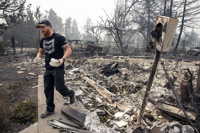Derek Trenton salvages some items at his parents home as wildfires devastate the region Friday in Talent, Ore. (AP Photo/Paula Bronstein)