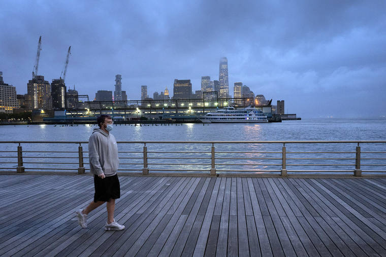 In this April 30 photo, a man wears a face mask as he walks on Pier 45 in Hudson River Park in New York. (AP Photo/Mark Lennihan, File)
