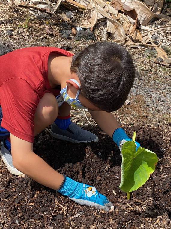 Courtesy photo A child participates in an outdoor learning activity about the uses of kalo and how to plant it during session one of ‘Imiloa’s Halau Lamaku program.