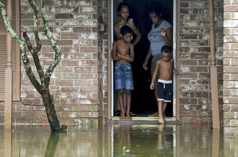 Eight-year-old Cam’ron Maltie, left, and Adrian Murray, 4, look at the their flooded front lawn during Tropical Storm Beta, Tuesday, Sept. 22, 2020, in Houston. Their family has been living in the home for a year and didn’t know the neighborhood flooded. (Godofredo A. Vásquez/Houston Chronicle via AP)