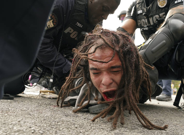 Louisville police detain a man after a group marched in protest over a lack of charges against Louisville police in Breonna Taylor’s death, Wednesday, Sept. 23, 2020, in Louisville, Ky. A grand jury indicted one officer on criminal charges six months after Taylor was fatally shot by police in Kentucky. Prosecutors said two officers who fired their weapons at Taylor were justified in using force to protect themselves after they faced gunfire from her boyfriend. (AP Photo/John Minchillo)