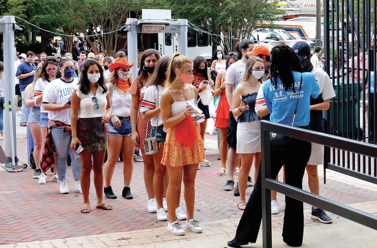 Many major universities are determined to forge ahead despite warning signs, as evidenced by the expanding slate of college football games occurring Saturday. The football-obsessed SEC begins its season with fans in stadiums. Several teams in other leagues have had to postpone games because of outbreaks among players and staff.