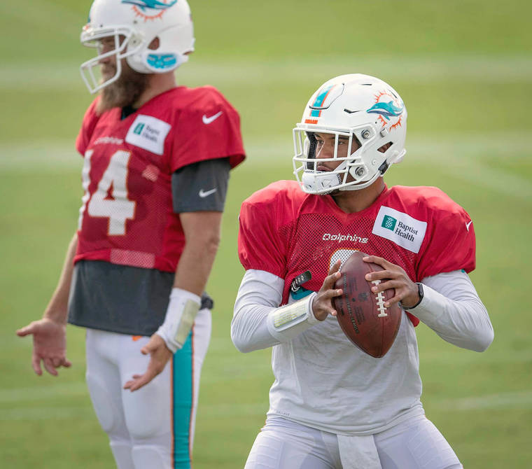 And Fitzpatrick believes Hawaii’s Tagovailoa, the No. 5 pick by Miami in the 2020 NFL draft, is going to be a great player based on what he has already seen from the young quarterback during roughly two months of Dolphins practices.