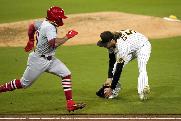 Associated Press San Diego’s Matt Strahm fields a ball to throw out St. Louis’ Kolten Wong on Thursday. Hilo's Wong drove in a run on the play and finished with four RBIs, including his fifth career playoff home run.