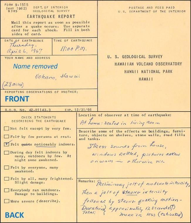 By 1930, Hawaii had earthquake report cards that were distributed to the community by HVO staff for people to write detailed information about what they observed during earthquakes.