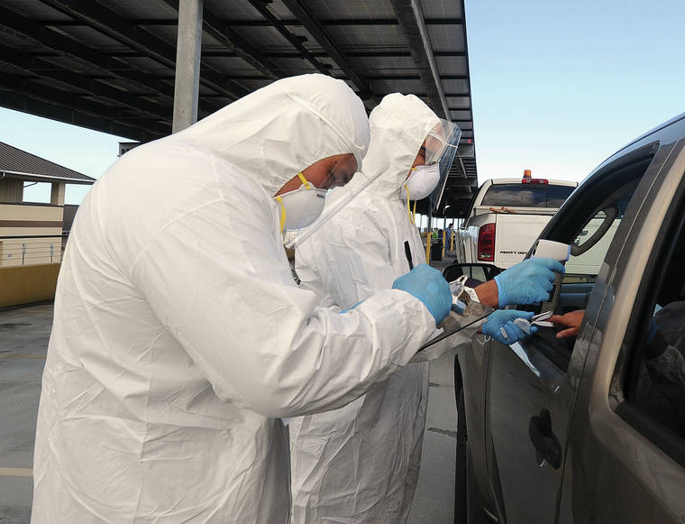 Members of the Hawaii Fire Department take vital signs at a drive-up COVID-19 testing Saturday at West Hawaii Civic Center. (Laura Ruminski/West Hawaii Today)