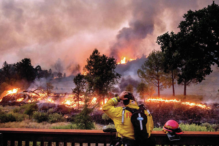 In this Aug. 21 file photo, a firefighter rubs his head while watching the LNU Lightning Complex fires spread through the Berryessa Estates neighborhood of unincorporated Napa County, Calif. (AP Photo/Noah Berger, File)