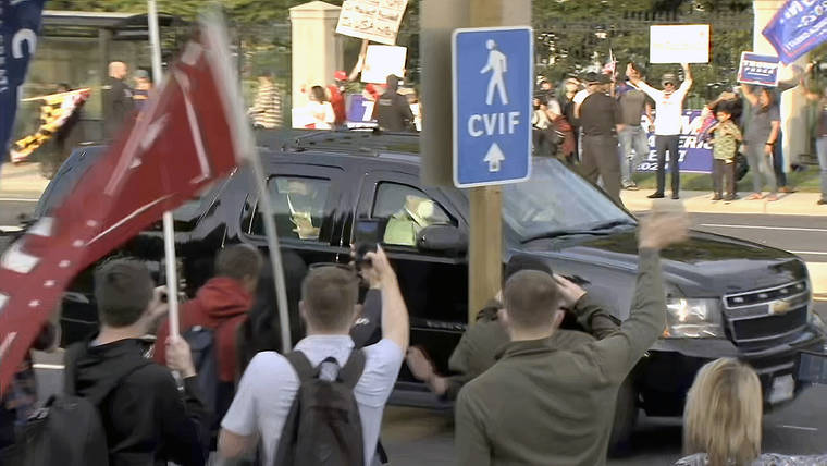 In this image from video, President Donald Trump waves as he drives past supporters gathered outside Walter Reed National Military Medical Center Sunday in Bethesda, Md. (AP Photo/Carlos Vargas)