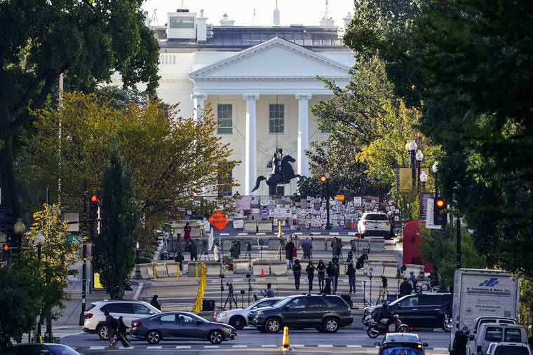 The White House is seen in Washington, early Tuesday, Oct. 6, 2020, the morning after President Donald Trump returned from the hospital where he was treated for COVID-19. Traffic moves along K Street NW as TV crews set up in Black Lives Matter Plaza. (AP Photo/J. Scott Applewhite)
