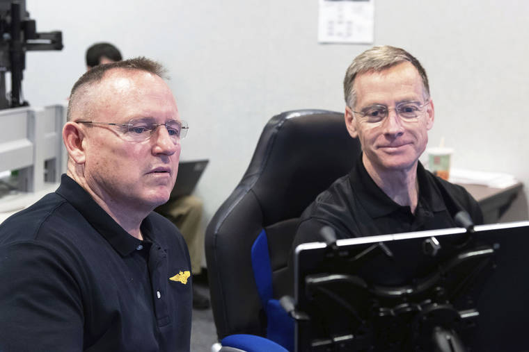 In this Nov. 29, 2018 photo made available by NASA, Commercial Crew Program & Boeing Crew Flight Test astronauts Butch Wilmore, left, and Chris Ferguson participate in a flight control simulation for a Boeing CST-100 Starliner capsule at the Johnson Space Center in Houston. On Wednesday, Oct. 7, 2020, Ferguson removed himself from the first Starliner crew, citing his daughter’s wedding in 2021. He has been replaced on the crew by Wilmore. (James Blair/NASA via AP)
