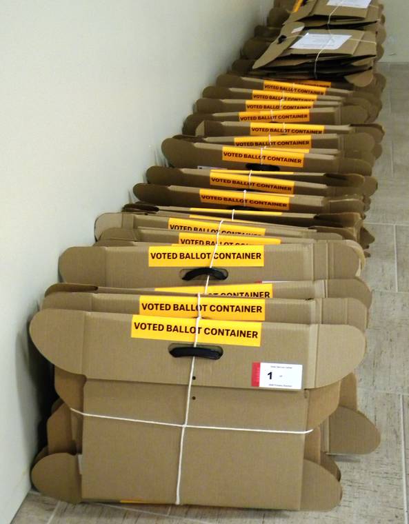 NANCY COOK LAUER/West Hawaii Today Ballot boxes are lined up at the county ballot counting center prior to the 2020 primary election.