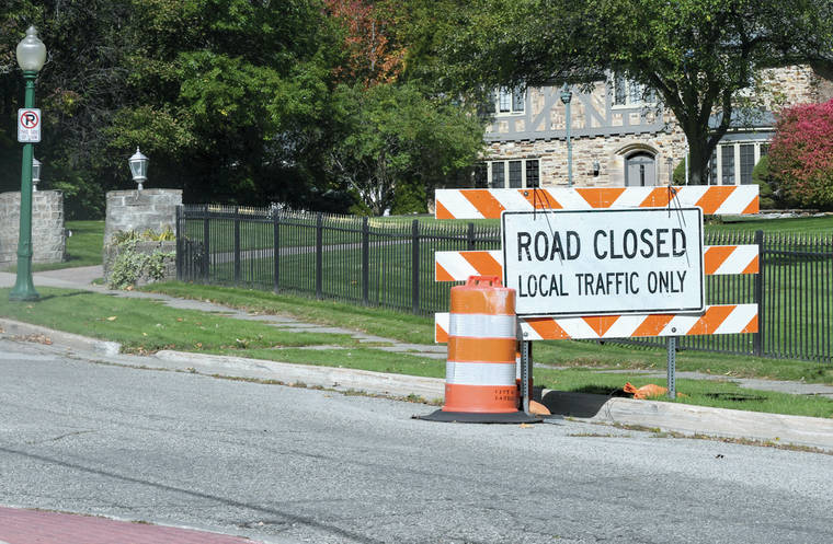 Barriers seen blocking traffic on Moores River Drive that leads toward the cul-de-sac near the Governor’s Mansion on Thursday, Oct. 8, 2020 in Lansing, Mich. Six people plotted to kidnap Michigan Democratic Gov. Gretchen Whitmer at her vacation home. That’s according to a criminal complaint unsealed Thursday. (Matthew Dae Smith/Lansing State Journal via AP)