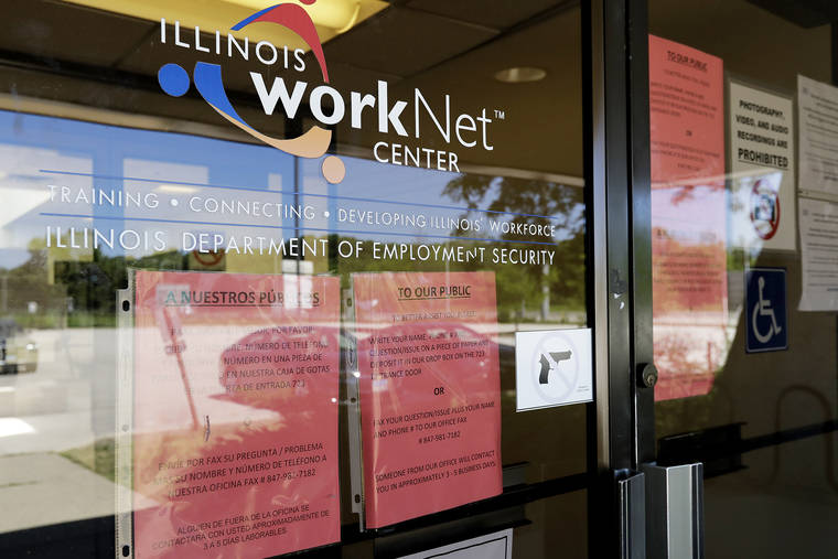 FILE - In this June 11, 2020, file photo, information signs are displayed at the closed Illinois Department of Employment Security WorkNet center in Arlington Heights, Ill. U.S. employers advertised for slightly fewer jobs in August while their hiring ticked up modestly. The Labor Department said Tuesday, Oct. 6, 2020, that the number of U.S. job postings on the last day of August dipped to 6.49 million, down from 6.70 million July. (AP Photo/Nam Y. Huh, File)