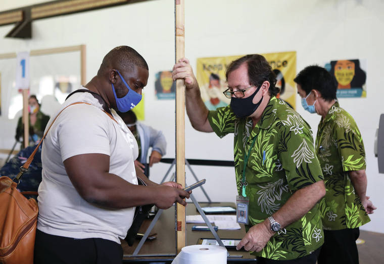 Among the staff working at the Hilo airport testing site are workers with Premier Medical Group, Civil Defense, the state Department of Health, the Hawaii Police Department and the Hawaii National Guard. Hanson said workers from each group are largely focused on managing specific aspects of the process — for example, the National Guard workers focus on assisting travelers who might not be electronic-savvy enough to easily handle the online Safe Travels Hawaii application and testing registration forms.
