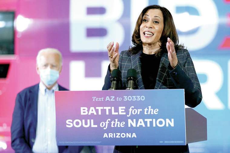 In this Oct. 8, 2020, photo, Democratic vice presidential candidate Sen. Kamala Harris, D-Calif., speaks at Carpenters Local Union 1912 in Phoenix, as Democratic presidential candidate former vice president Joe Biden listens. Biden’s presidential campaign says Harris will suspend in-person events until Oct. 19, after two people associated with the campaign tested positive for coronavirus. (AP Photo/Carolyn Kaster)