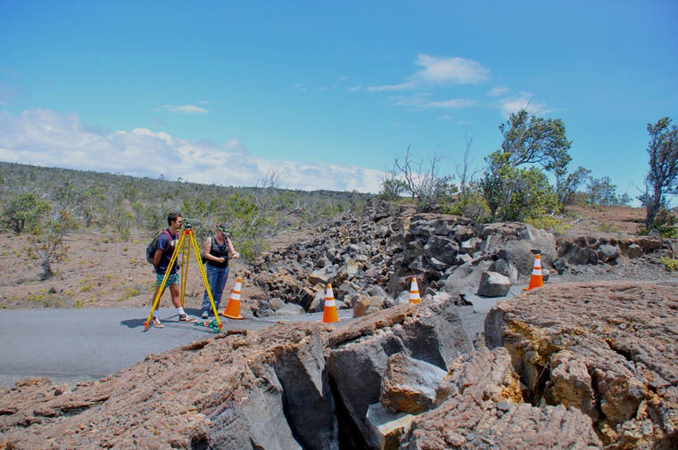 Courtesy of STEVE LUNDBLAD/University of Hawaii at Hilo University of Hawaii at Hilo geology majors measure vertical offset of Hilina Pali Road on Kulanaokuaiki Pali in Hawaii Volcanoes National Park shortly after the end of Kilauea’s 2018 eruption. Events in 2018 offset the road at this location by approximately 20 cm (8 in).