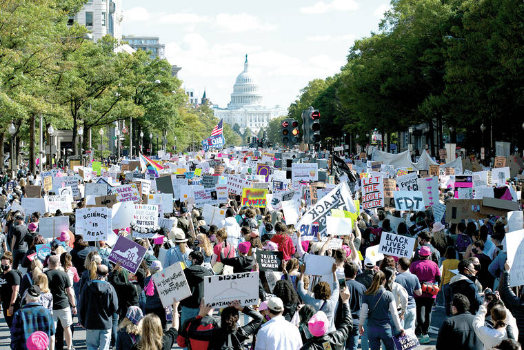 Thousands of mostly young women in masks rallied Saturday in the nation’s capital and other U.S. cities, exhorting voters to oppose President Donald Trump and his fellow Republican candidates in the Nov. 3 elections.