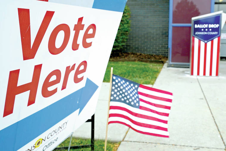 FILE - In this Oct. 20, 2020 file photo, a voting location is shown in Mission, Kan. A new survey by The Associated Press-NORC Center for Public Opinion Research and USAFacts finds that while voters say it’s pretty easy to find accurate information about voting, they have a harder time knowing whether there’s any factual basis for the information they’re getting from and about the candidates. (AP Photo/Charlie Riedel)