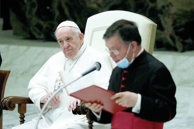 Pope Francis listens to a priests introducing the group of faithful attending the weekly general audience in the Paul VI hall at the Vatican, Wednesday, Oct. 21, 2020. (AP Photo/Gregorio Borgia)