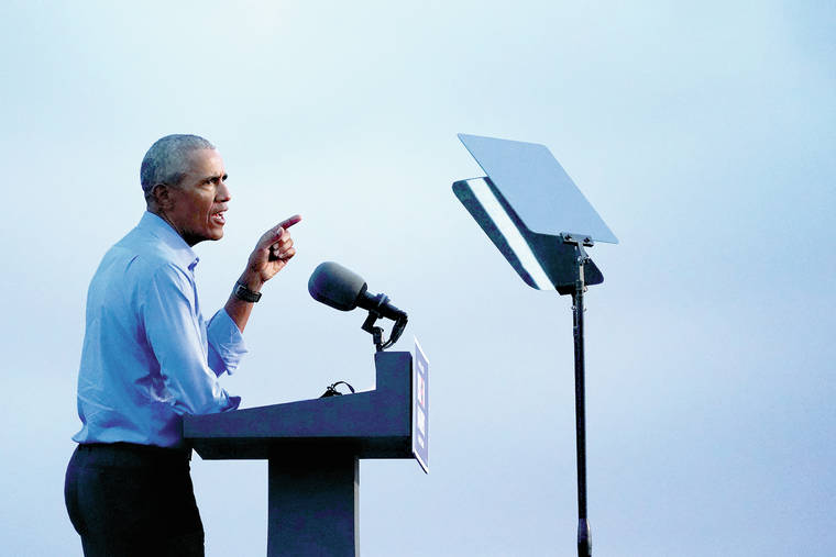 With less than two weeks before Election Day, Obama used a drive-in campaign rally in Philadelphia to assure voters that Biden and his running mate, Kamala Harris, can mend a fractured country. He lauded the merits of democracy and citizenship as “human values” that the United States must again embrace.