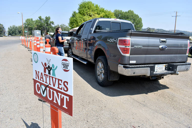 Vehicles stop at a drive-thru U.S. Census participation campaign organized by Montana Native Vote on the Crow Indian Reservation on Aug. 26 in Lodge Grass, Mont. (AP Photo/Matthew Brown)