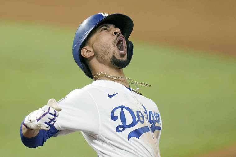 Los Angeles Dodgers’ Mookie Betts celebrates after a home run against the Tampa Bay Rays during the eighth inning in Game 6 of the baseball World Series Tuesday, Oct. 27, 2020, in Arlington, Texas. (AP Photo/Eric Gay)