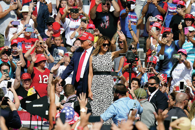 President Donald Trump and first lady Melania Trump arrive for a campaign rally Thursday in Tampa, Fla. (AP Photo/Chris O'Meara)