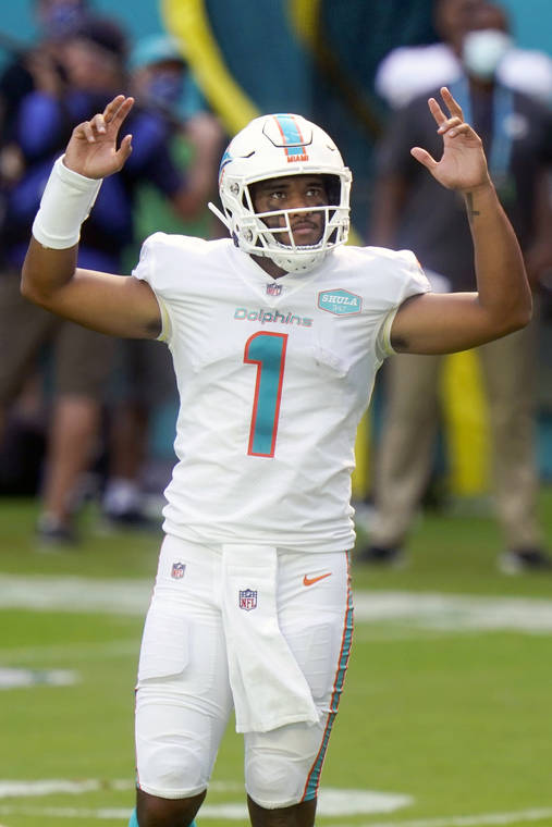MIAMI GARDENS, Fla. — On the sideline, Tua Tagovailoa showed plenty of moves. He entertained those along the bench by dancing after the Miami Dolphins’ first touchdown, and greeted 5-foot-6 Jakeem Grant with a leaping chest bump to the face mask after another score.