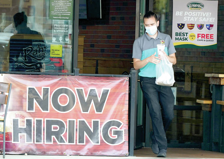 FILE - In this Sept. 2, 2020 file photo, a customer wears a face mask as they carry their order past a now hiring sign at an eatery in Richardson, Texas. The number of Americans seeking unemployment benefits fell last week to 751,000, the lowest since March, but it’s still historically high and indicates the viral pandemic is still forcing many employers to cut jobs. (AP Photo/LM Otero, File)