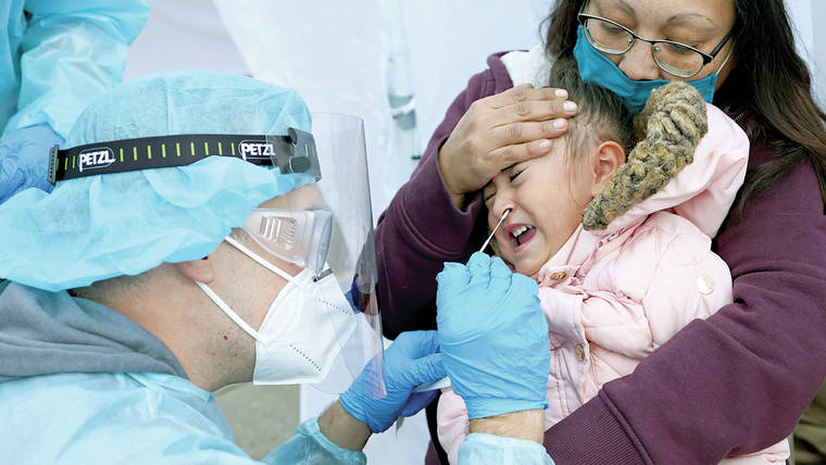 FILE - In this Nov. 10, 2020, file photo, Kim Tapia holds her granddaughter Amariah Lucero, 3, as she’s tested at the Utah National Guard’s mobile testing site for COVID-19 in Salt Lake City. The U.S. has recorded about 10.3 million confirmed infections, with new cases soaring to all-time highs of well over 120,000 per day over the past week. (AP Photo/Rick Bowmer, File)