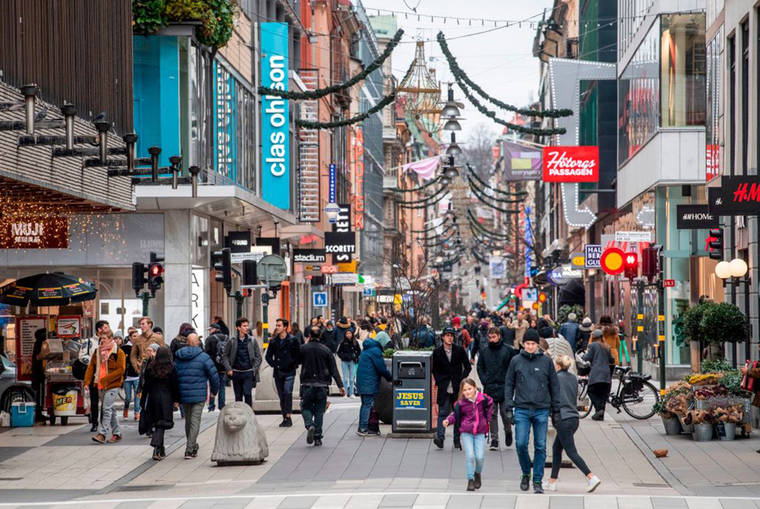People stroll at the Drottninggatan shopping street in central Stockholm on November 10, 2020, amid the novel coronavirus COVID-19 pandemic. (Photo by FREDRIK SANDBERG/TT News Agency/AFP via Getty Images/TNS)