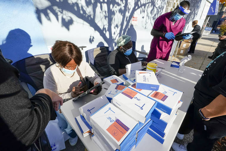 FILE - In this Nov. 10, 2020, Tia Richardson, seated left, Gracelyn Morris, center, and Kenned Yakpoh record information from residents before administering coronavirus tests at the Central Family Life Center, in the Stapleton neighborhood of the Staten Island borough of New York. School systems in several states are giving up on in-person classes, and some governors are reimposing restrictions on bars and restaurants or getting more serious about masks, as the coast-to-coast resurgence of the coronavirus sends deaths, hospitalizations and new infections soaring. (AP Photo/Mary Altaffer, File)