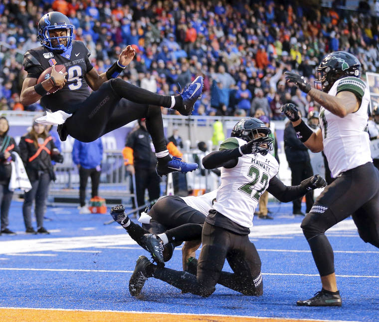 Boise State quarterback Jaylon Henderson (9) goes airborne over Hawaii defensive back Khoury Bethley, middle, and Hawaii defensive back Ikem Okeke, right, for a 5 yard touchdown during the second half of an NCAA college football game for the Mountain West Championship Saturday, Dec. 7, 2019, in Boise, Idaho. (AP Photo/Steve Conner)