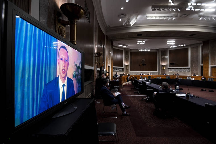 Facebook CEO Mark Zuckerberg testifies remotely during a Senate Judiciary Committee hearing on Facebook and Twitter’s actions around the closely contested election on Tuesday, Nov. 17, 2020, in Washington.. (Bill Clark/Pool via AP)