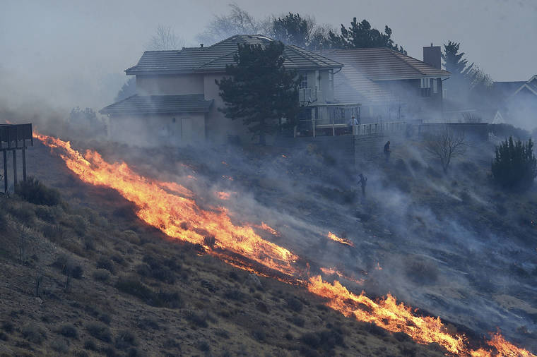 People try to protect their homes during the Pinehaven Fire in the Caughlin Ranch area of Reno, Nev., on Tuesday, Nov. 17, 2020. (Jason Bean/The Reno Gazette-Journal via AP)