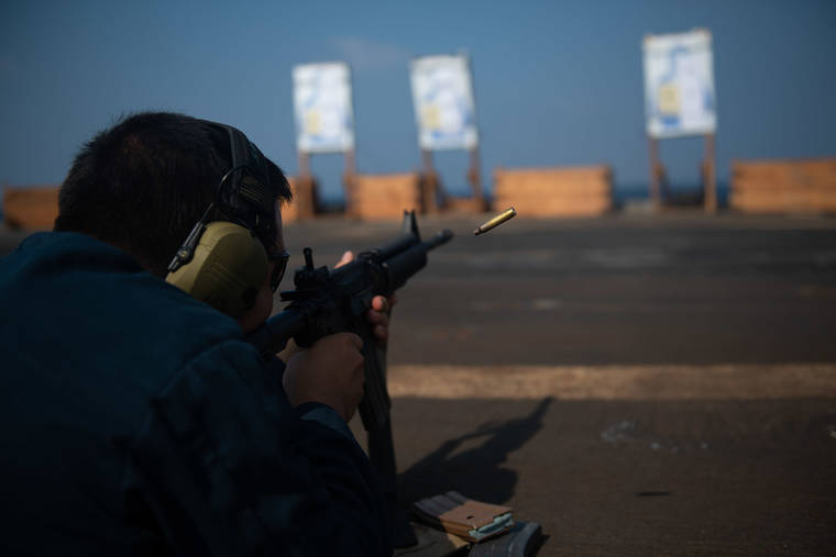 Gunner’s Mate 2nd Class Kalani Ignacio of Hilo fires an M4 rifle during a live-fire exercise Nov. 15 on the flight deck of the guided-missile cruiser USS Princeton (CG 59) in the Arabian Sea. Princeton is part of Nimitz Carrier Strike Group and is deployed to the U.S. 5th Fleet area of operations to ensure maritime stability and security in the Central Region, connecting the Mediterranean and Pacific through the Western Indian Ocean and three critical chokepoints to the free flow of global commerce.