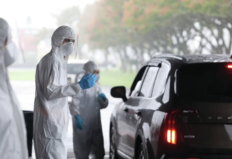 Kelsey Walling/Tribune-Herald A COVID-19 tester with S&G Labs asks a car to pull up during free drive-through testing Wednesday at Afook-Chinen Civic Auditorium in Hilo.